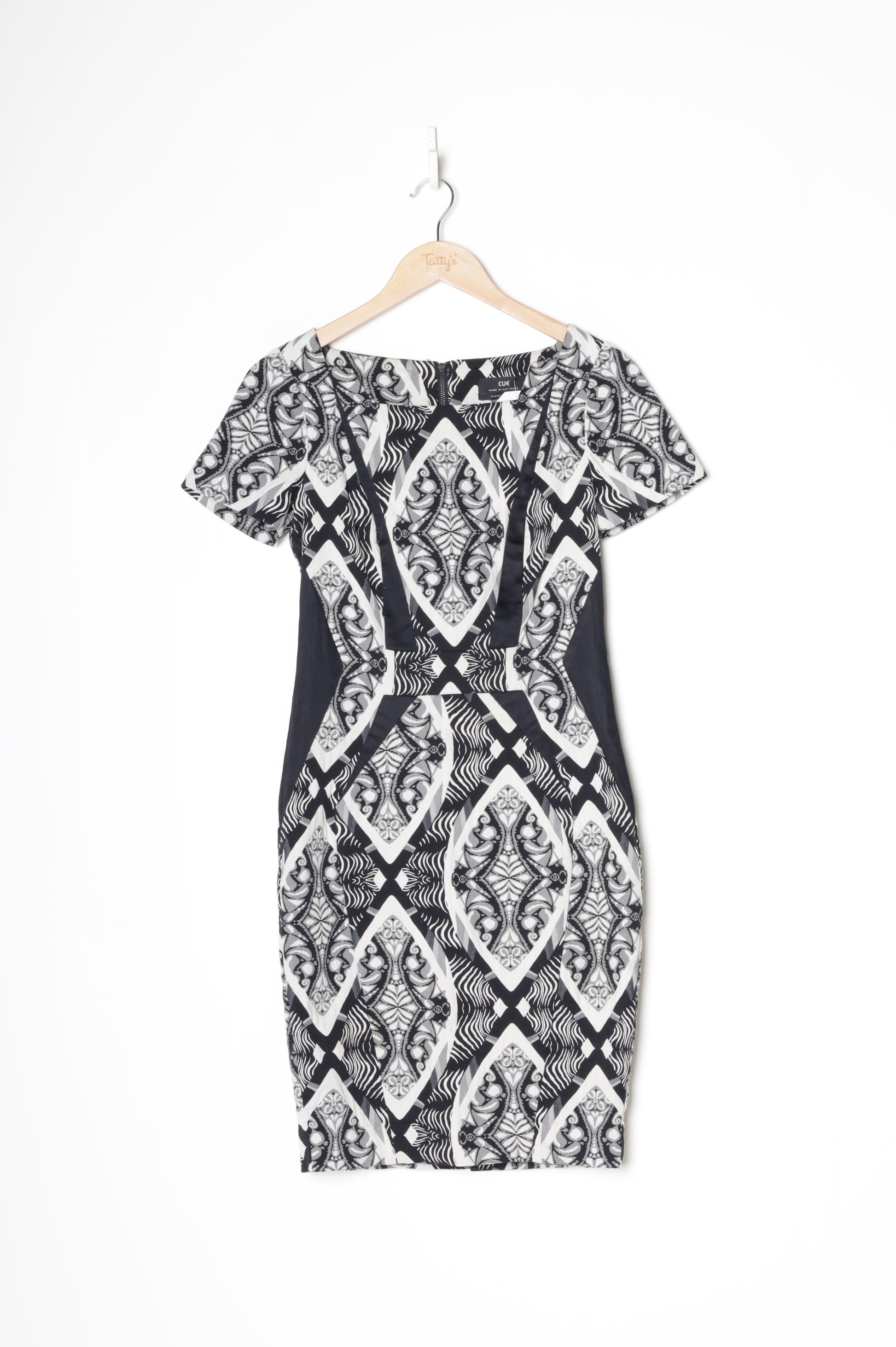Jagged square neck, short sleeved, back zip closure, midi length sheath dress in baroque jacquard fabric(Black/white)