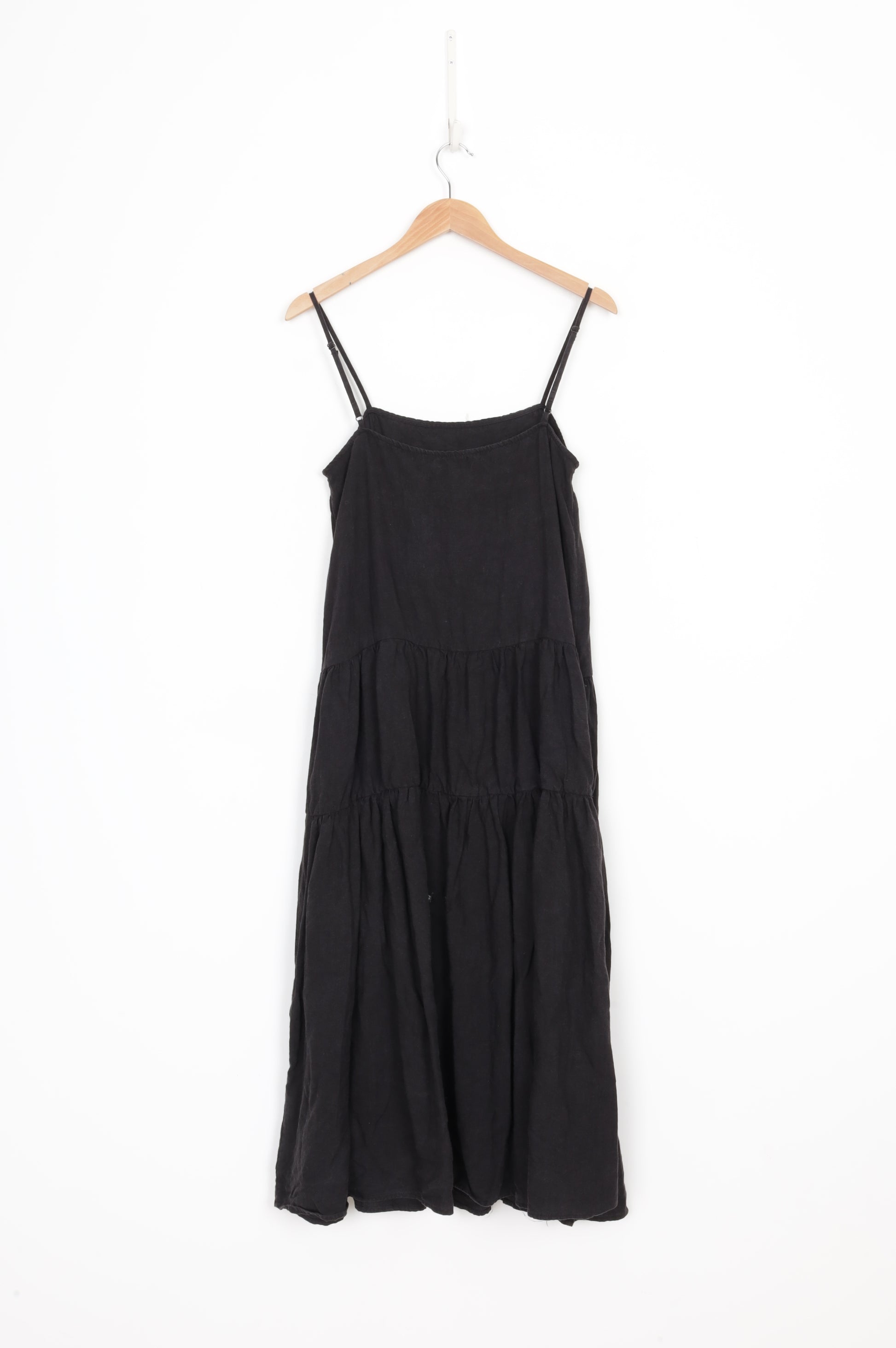 Squared neckline, spaghetti strapped, tiered linen midi dress (worn)