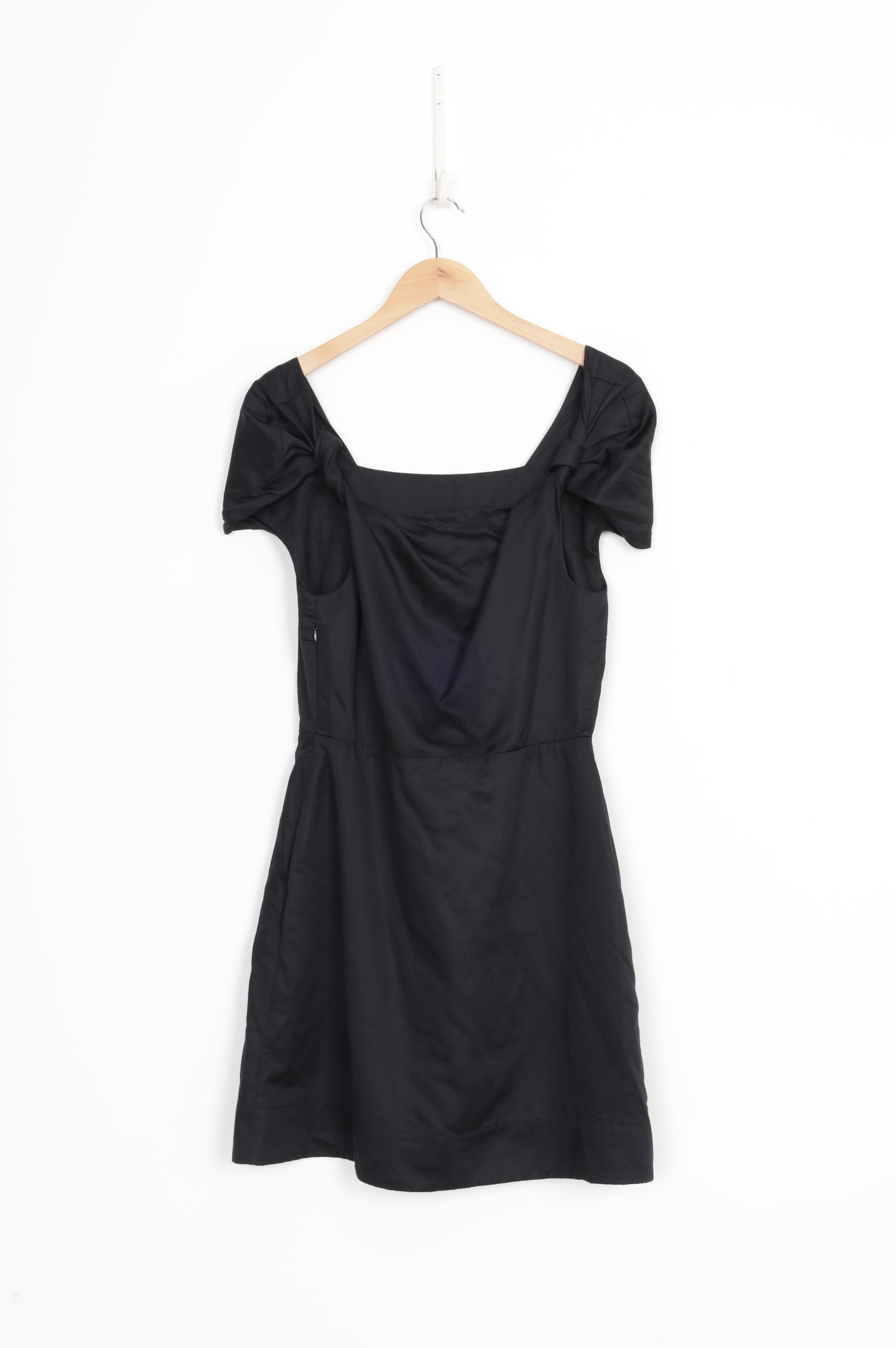 Squared neckline, zip side, twist strap, shift mini dress