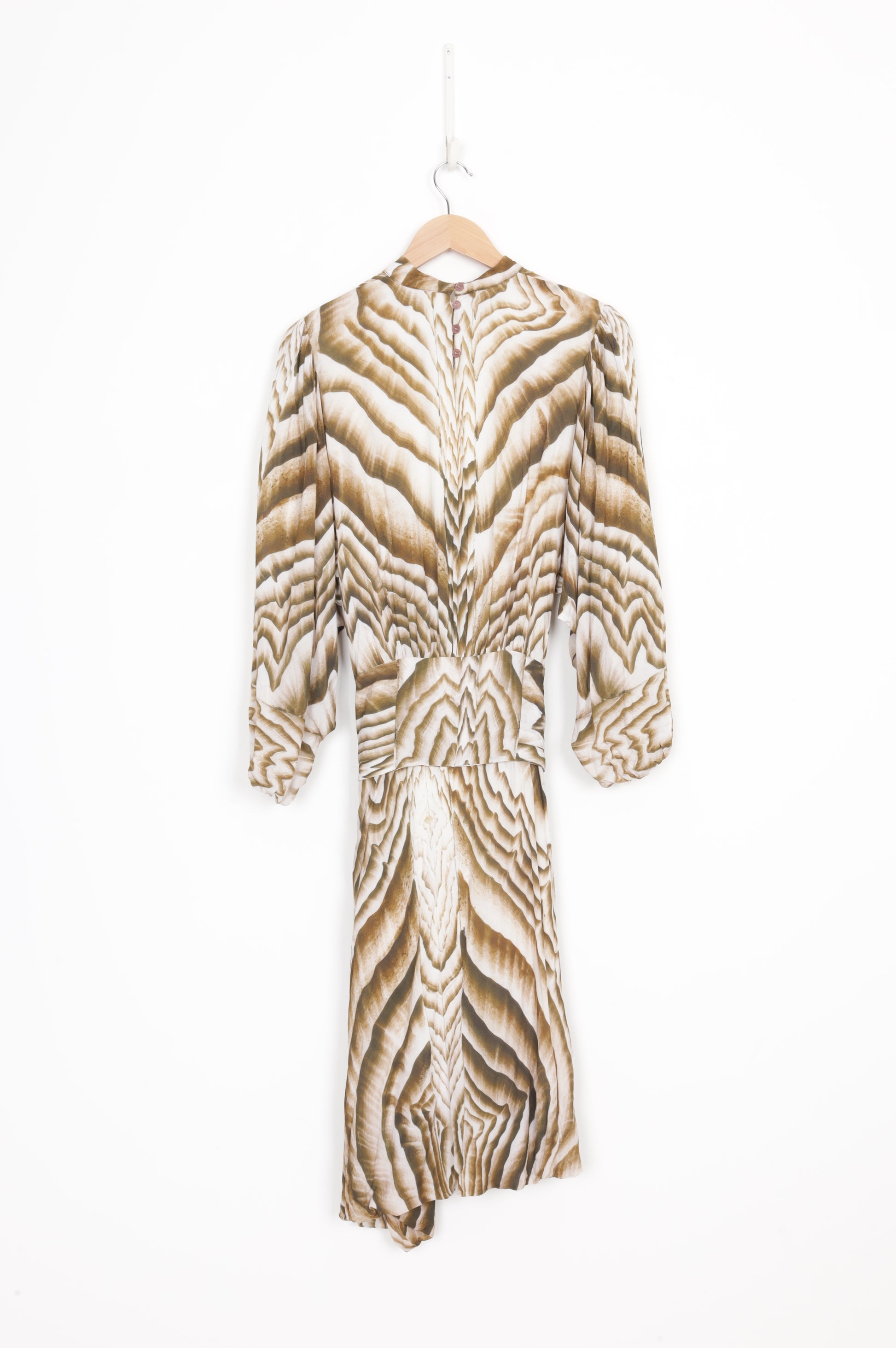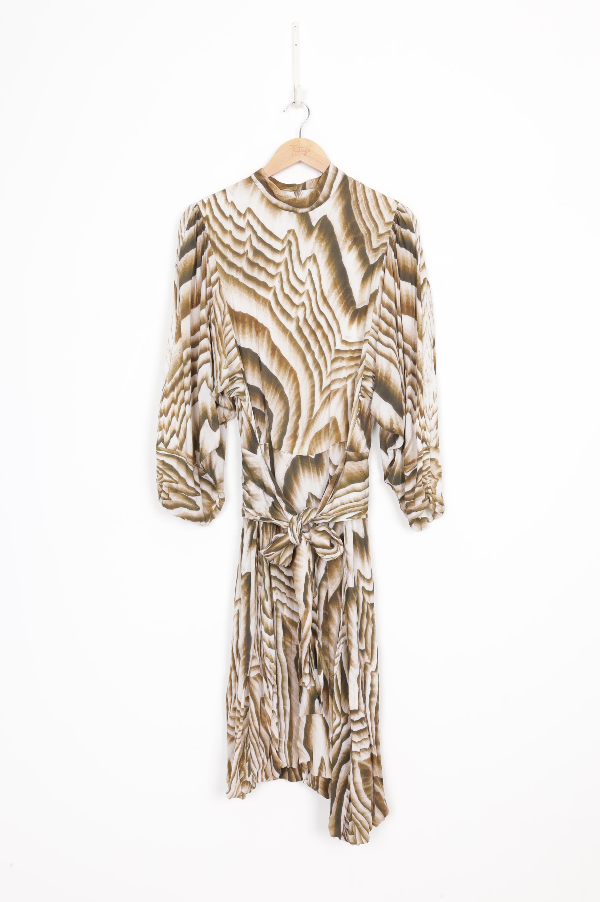 Long sleeves viscose midi dress with waist belt attached, round neck with back key hole. green and white sand pattern