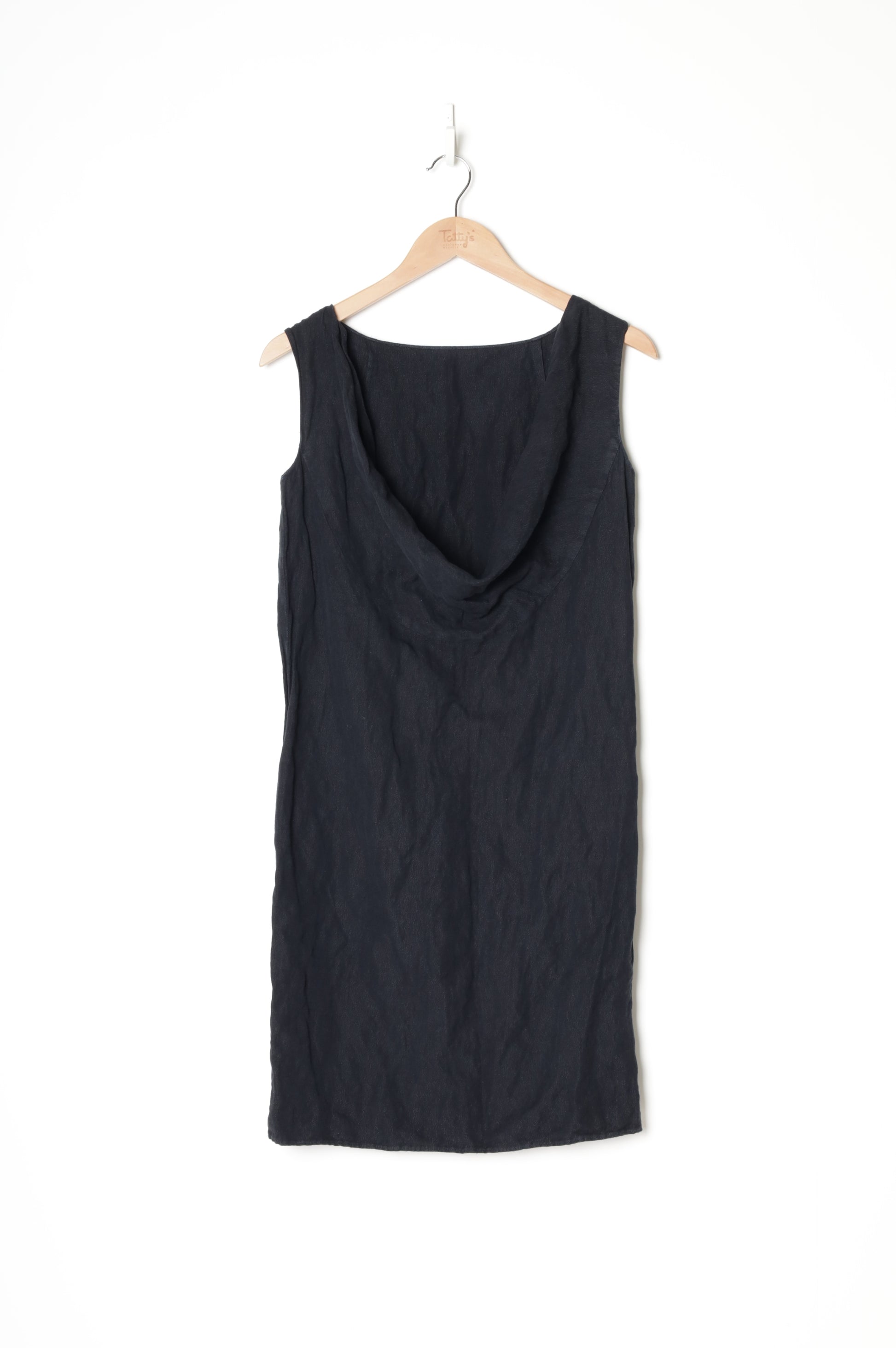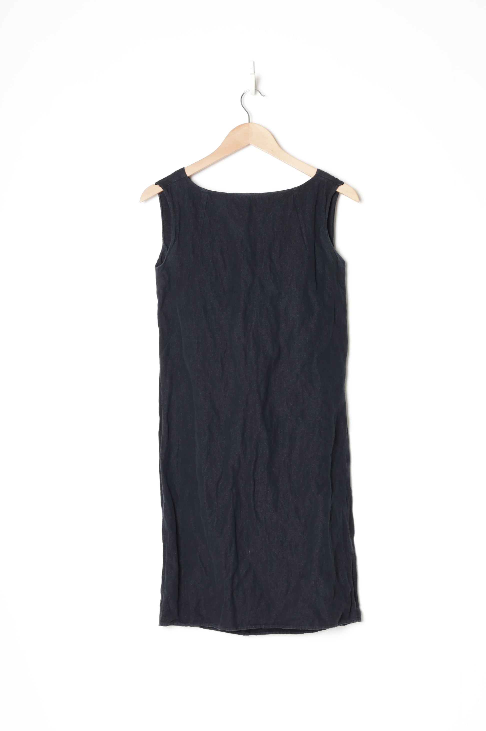 Linen cotton blend sleeveless straight midi dress with boat neck and cowl back *Worn and marked underarms *